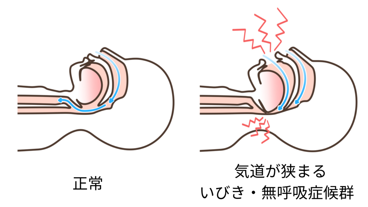奥歯の噛み合わせが悪いために下あごが後退すると、気道が潰されて狭くなるために、いびきや睡眠時無呼吸症候群の原因になることがあります。
