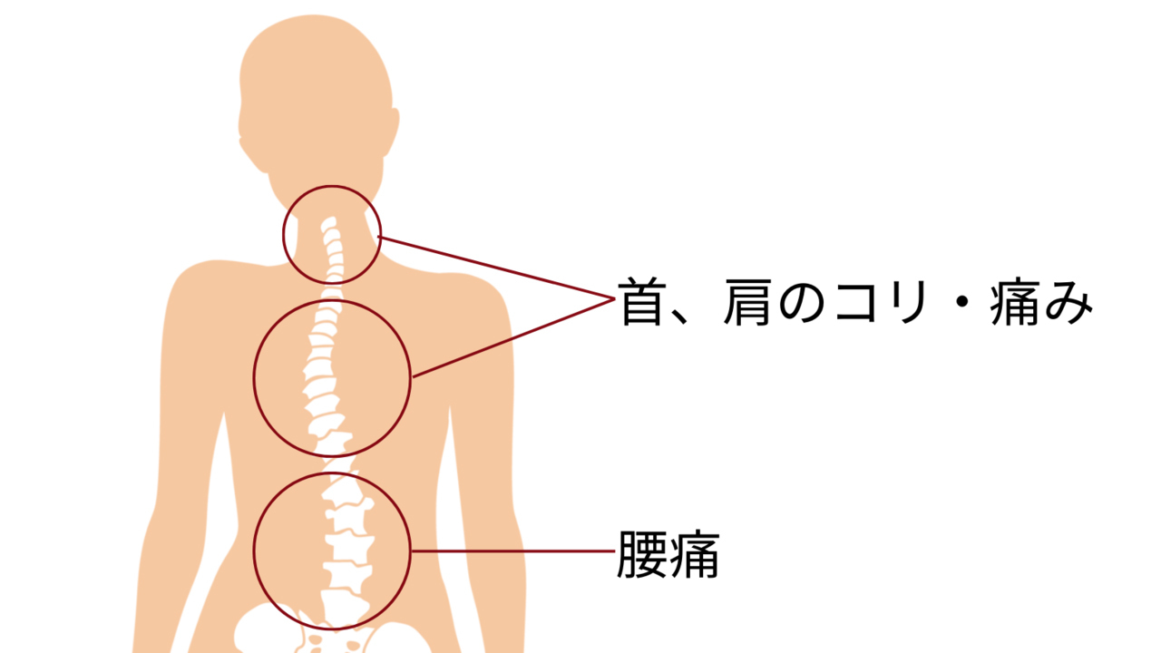 この歪みが、首・肩・腰の筋肉に余計な負担をかけることになり、この負担によって筋肉が硬直。